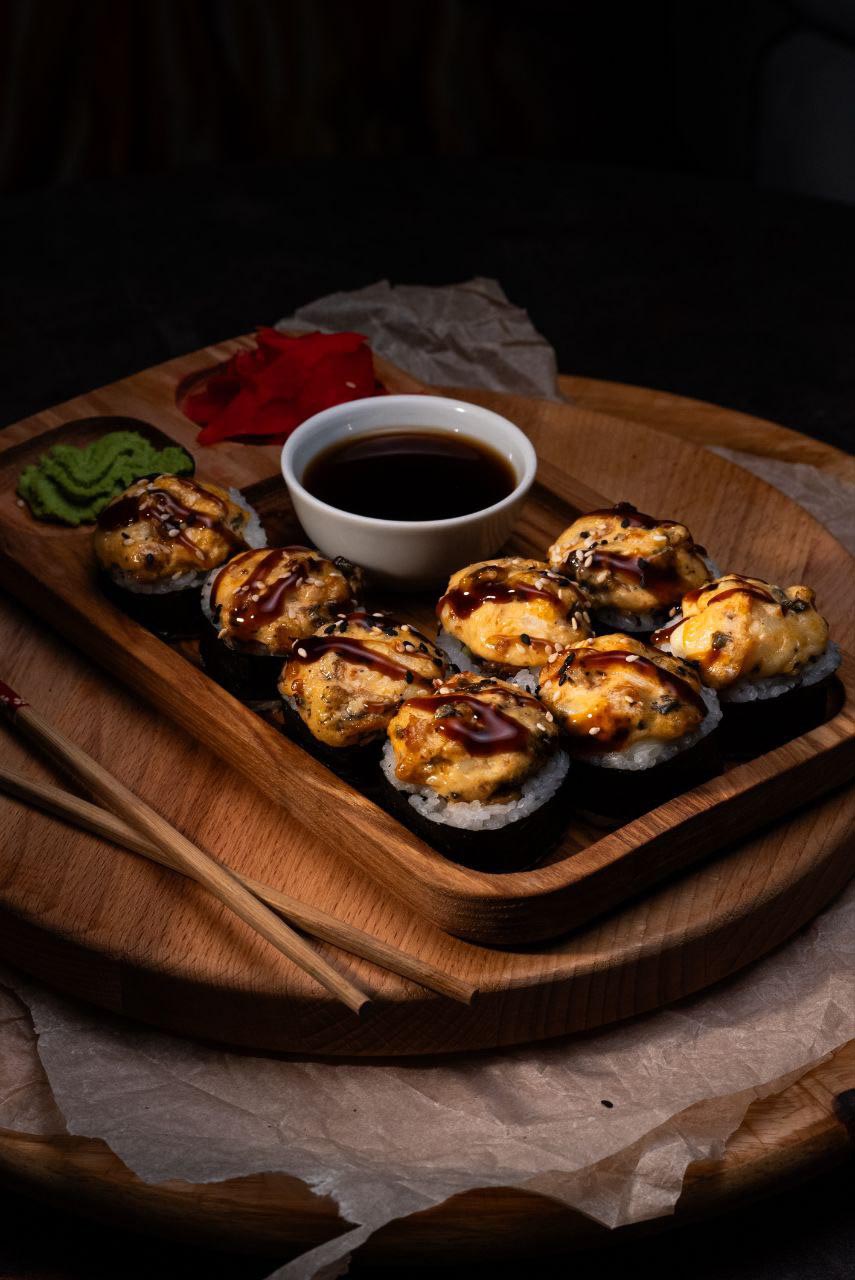 В составе нори, рис, креметта, курица, угорь, огурец, омлет, спайси соус, имбирь, васаби, соевый соус.